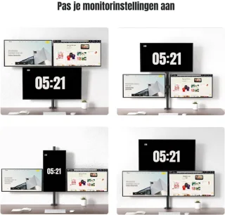 - Stel de hoogte, hoek en rotatie van elk scherm in zodat je monitoren op ooghoogte staan voor een ergonomische werkhouding.